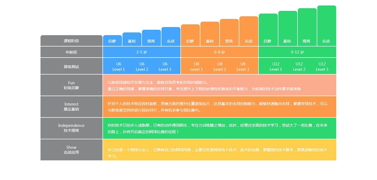 QTP5.0将儿童学习网球划分4 Levels,每个Level设10 Ranks,分设40级Ranks。旨在构建孩子网球技术、身体素质和运动认知三大成长要素,抓住儿童运动成长黄金期。